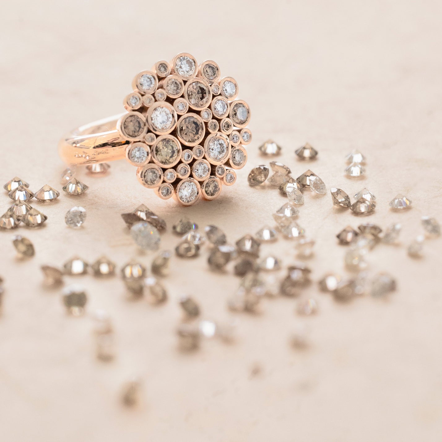 Diamant ist der ultimative Edelstein: brillant, stark und langlebig. Bekannt für sein unvergleichliches Funkeln und seine Symbolik der Liebe und der Ewigkeit. Bei Bron arbeiten wir nicht nur mit klassischen weißen Diamanten, sondern auch mit champagnerfarbenen und blauen Diamanten für einen modernen, unverwechselbaren Look. Viele unserer Designs verfügen über Pavé-Einfassungen, in denen kleine Diamanten einen schillernden, strahlenden Effekt erzeugen.