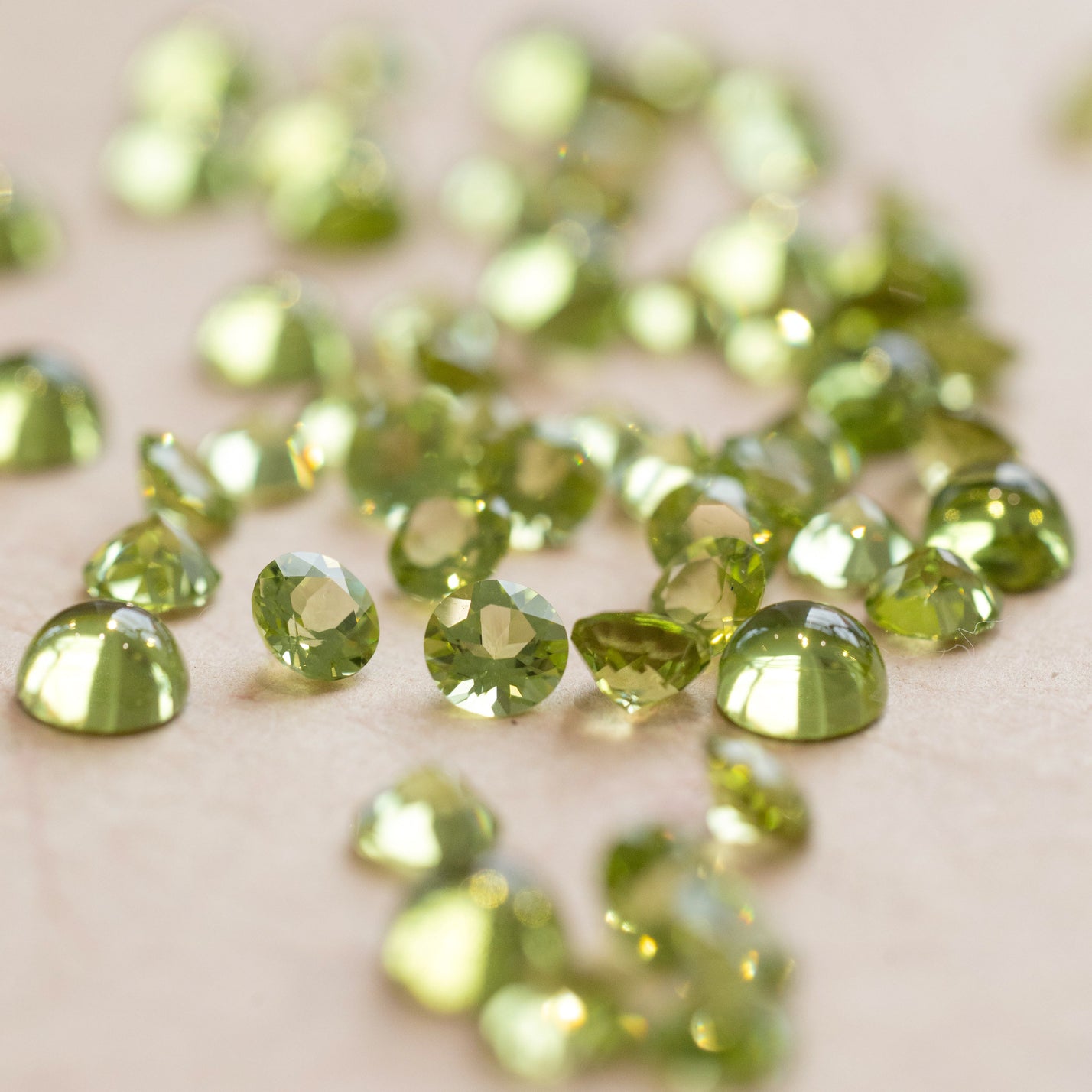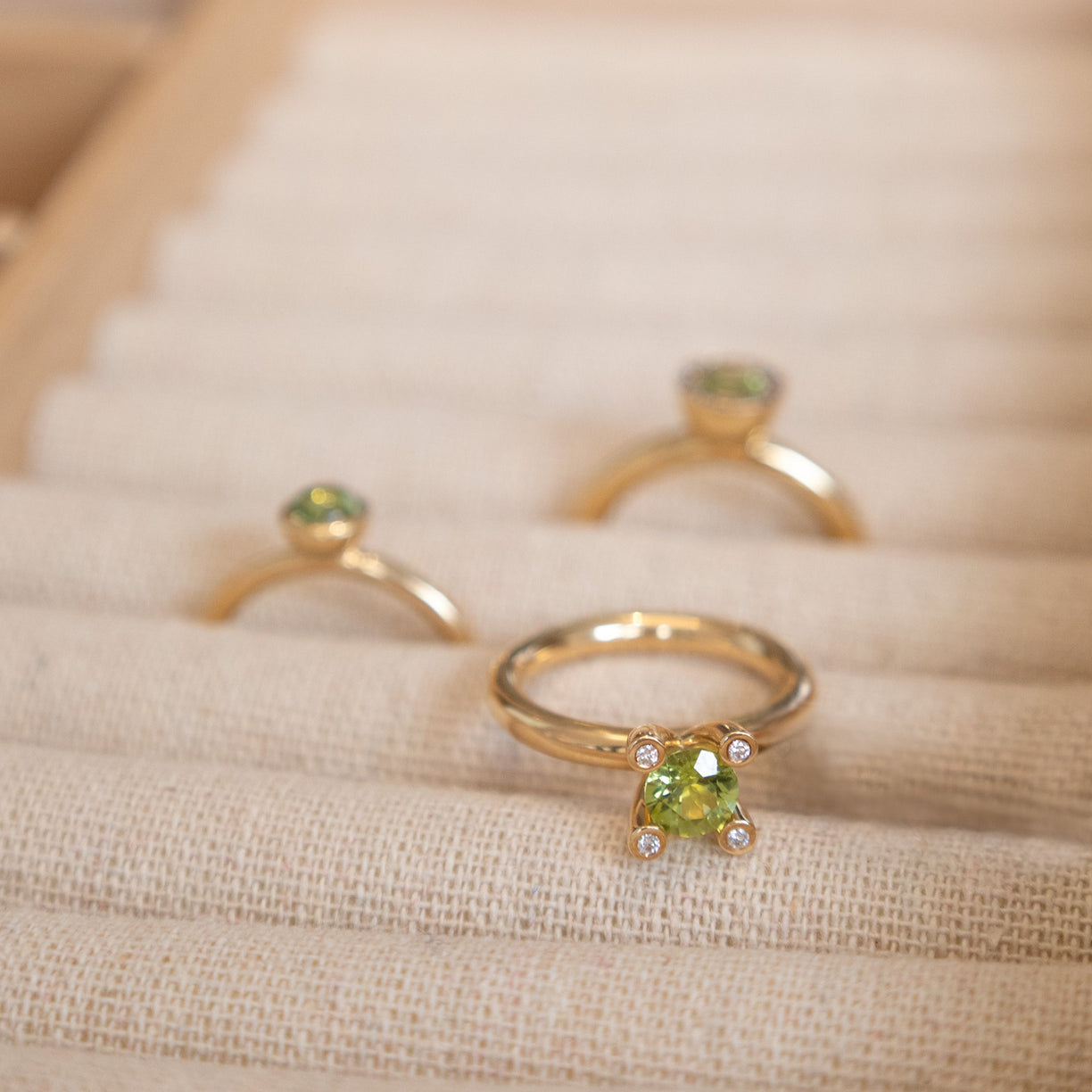 Der Peridot ist einer der wenigen Edelsteine, die nur in einer Farbe erhältlich sind, nämlich in leuchtenden Grüntönen. Je nach Eisengehalt reichen seine Nuancen von Limetten- oder Goldgrün bis zu einem hellen Oliv. Wie Sonnenlicht, das durch belaubte Bäume schimmert, hat er eine sommerliche Ausstrahlung – eine perfekte Wahl als Geburtsstein „August“.