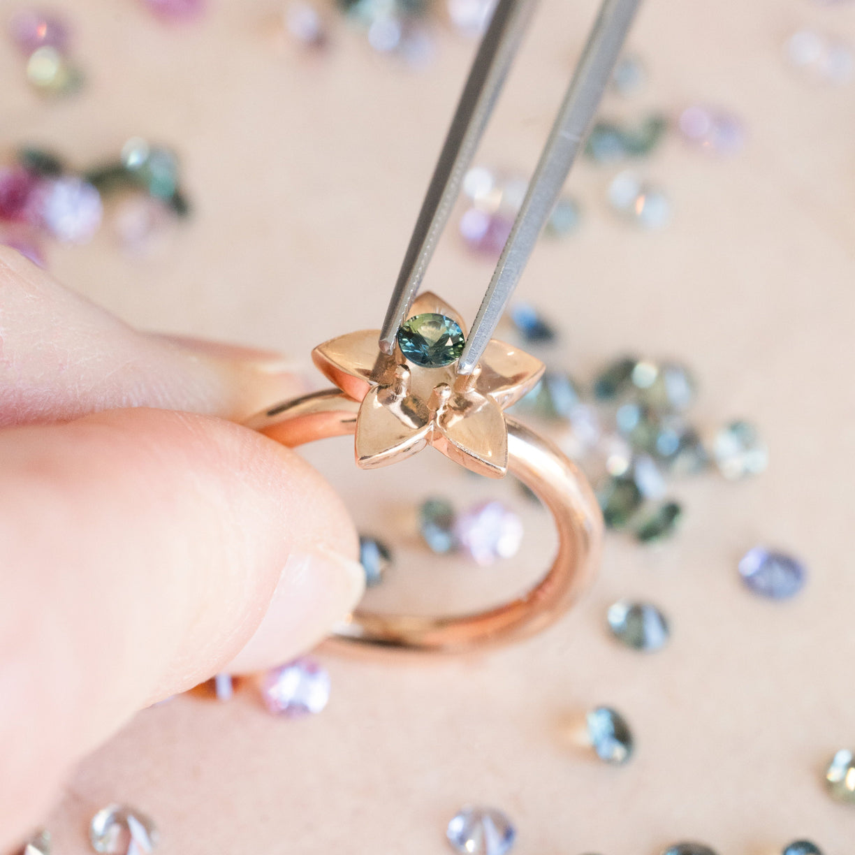Rubin und Saphir sind wie Bruder und Schwester. Beide Edelsteine werden aus dem Mineral Korund hergestellt und haben die gleiche Zusammensetzung und Struktur. Ihre Farbunterschiede entstehen durch Spuren chemischer Elemente im Korund - wie Chrom beim Rubin oder Titan und Eisen beim blauen Saphir. Saphir kommt tatsächlich in fast allen Farben vor, einschließlich Grau und Schwarz. Die zarte Variante mit dem femininen rosa-orange Ton heißt Padparasha, die „Lotusblüte.“