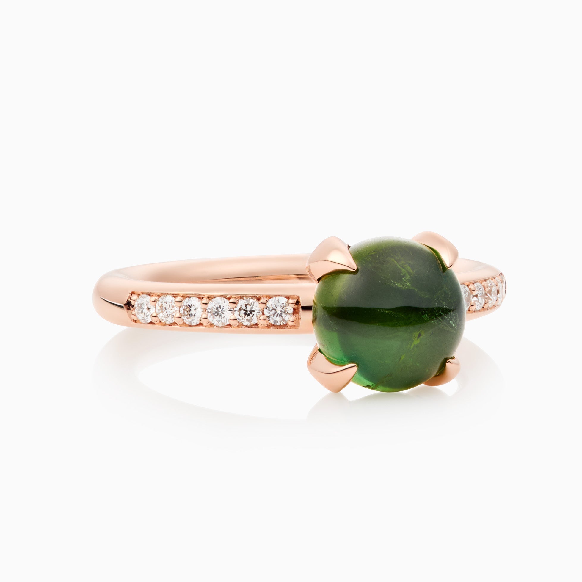 Unser beliebter kleinster Catch Ring ist jetzt mit einem diamantbesetzten Band erhältlich. Hier mit grünem Turmalin im Cabochon-Schliff.