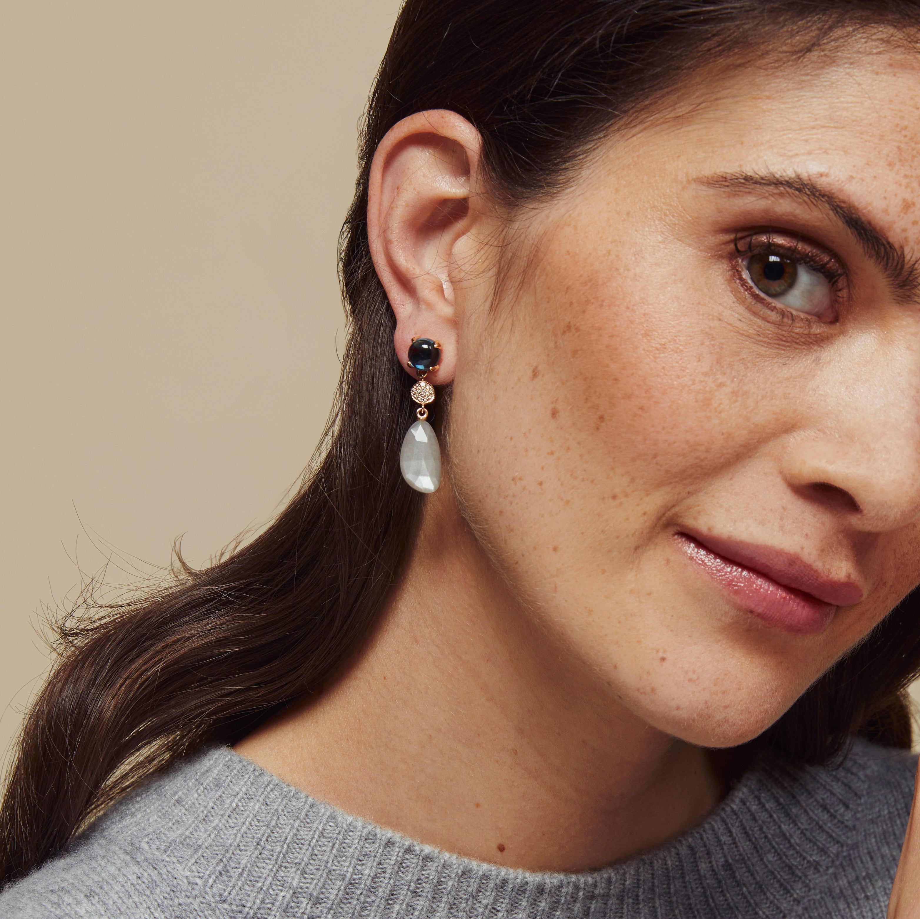 London Blue Topas, champagner Diamant und grauer Mondstein. Ein femininer Look für jeden Tag.