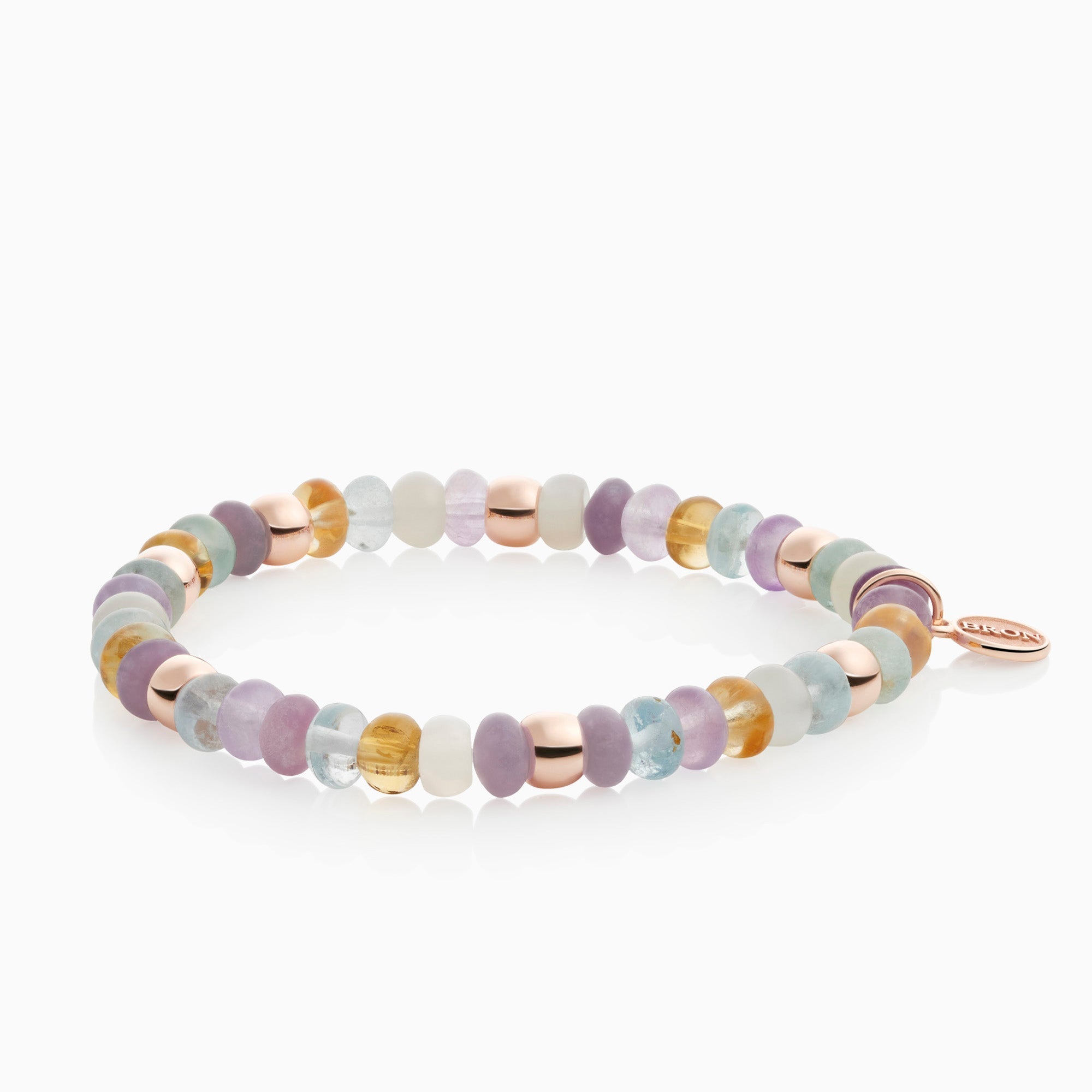 Unser Edelsteinarmband mit sieben goldenen Kugeln und einem goldenen Bron-Tag. Hier in unserem Color Theme Pastel. Limitierte Auflage.