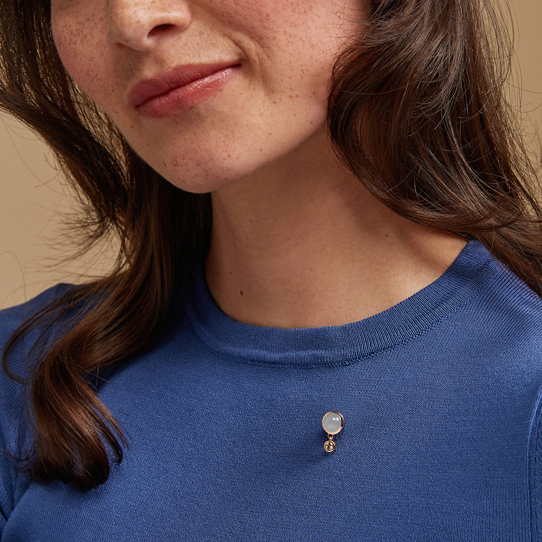 Süße kleine Sushi Brosche mit einem Aquamarin im Cabochon-Schliff und einem baumelnden gelben Saphir. Verschönern Sie Ihr Kleid, verschönern Sie Ihren Tag!