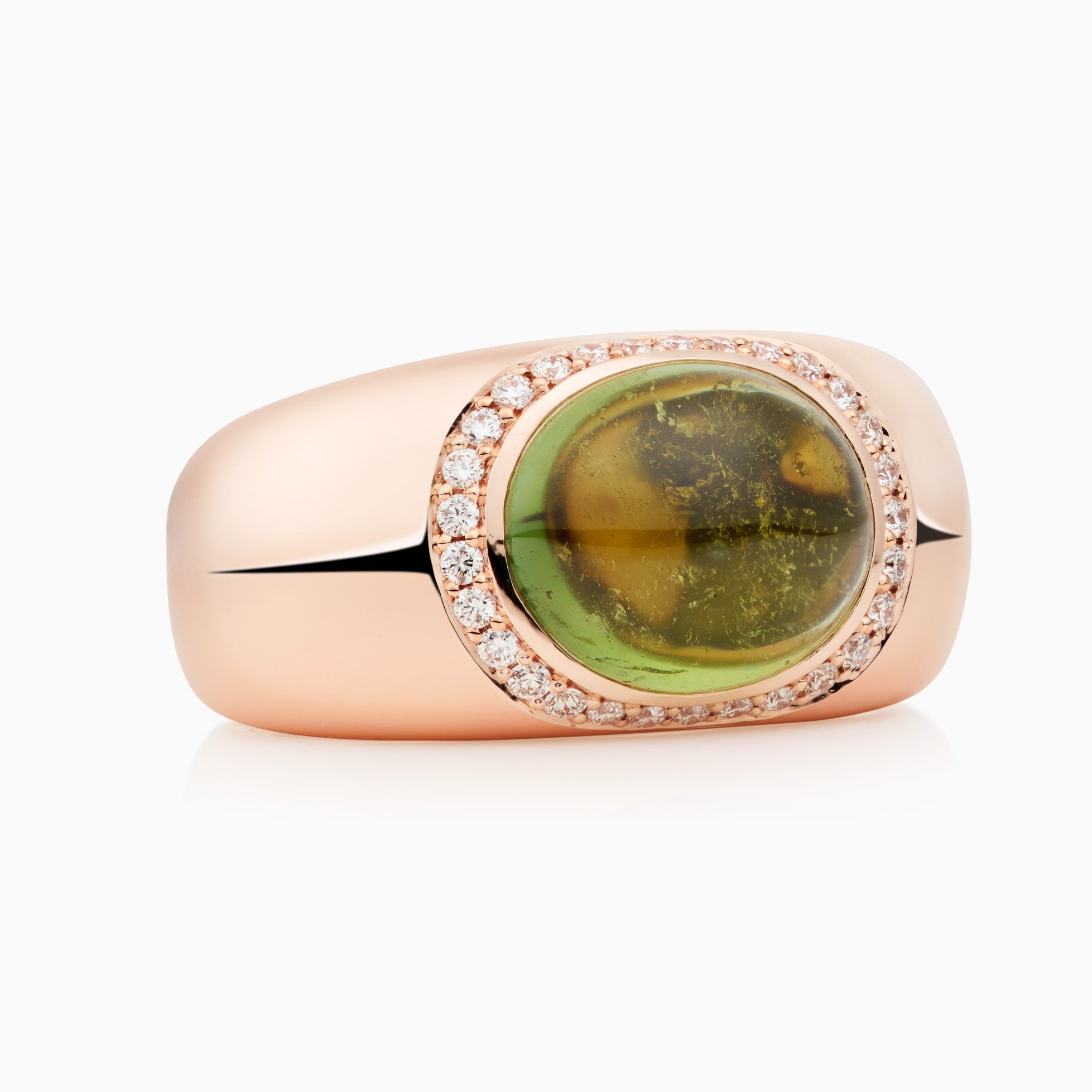 Gold hat eine hohe Dichte - Sie werden sein Gewicht spüren, wenn Sie diesen massiven Ring mit Cabochon-Turmalin aufstecken. Schwer und doch unglaublich bequem dank seines skulpturalen Designs. Der Stein ist von einem zarten weißen Diamantkranz umrahmt.