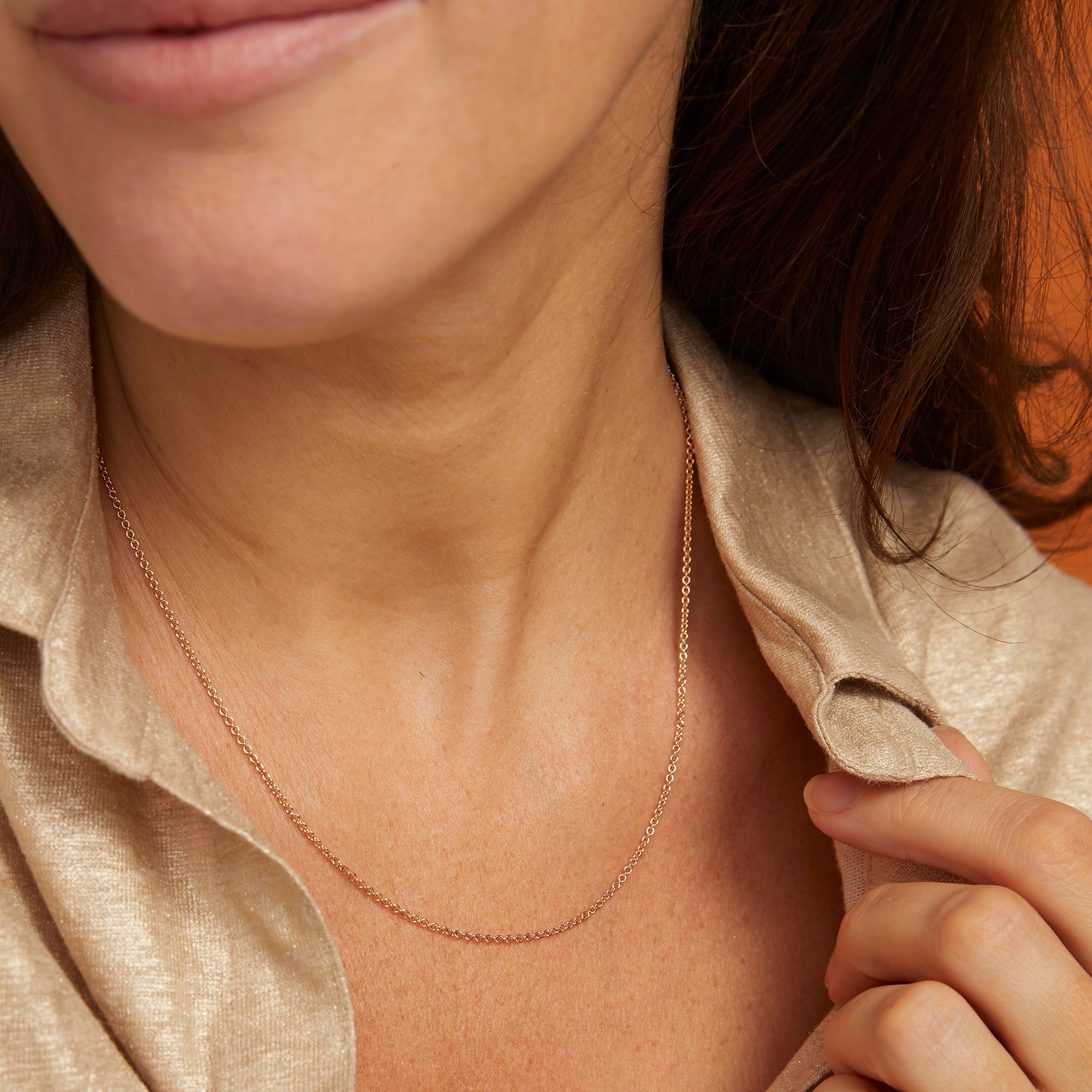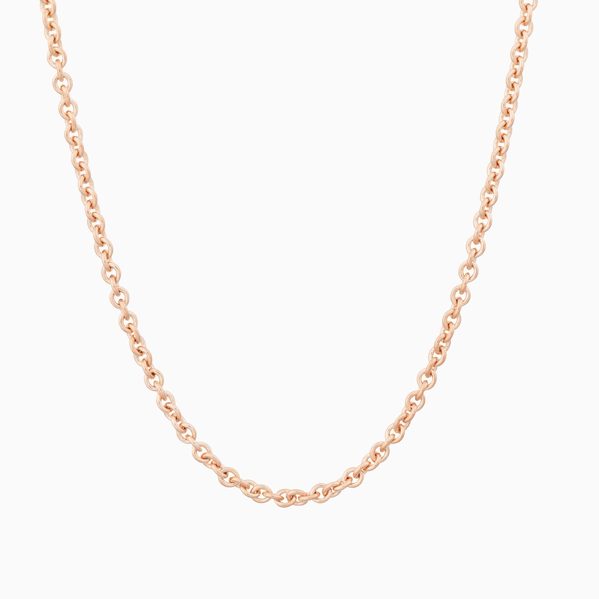 Zarte Kette aus massiven, runden Gliedern. In verschiedenen Längen erhältlich. Am Modell getragen in Länge 45 cm.