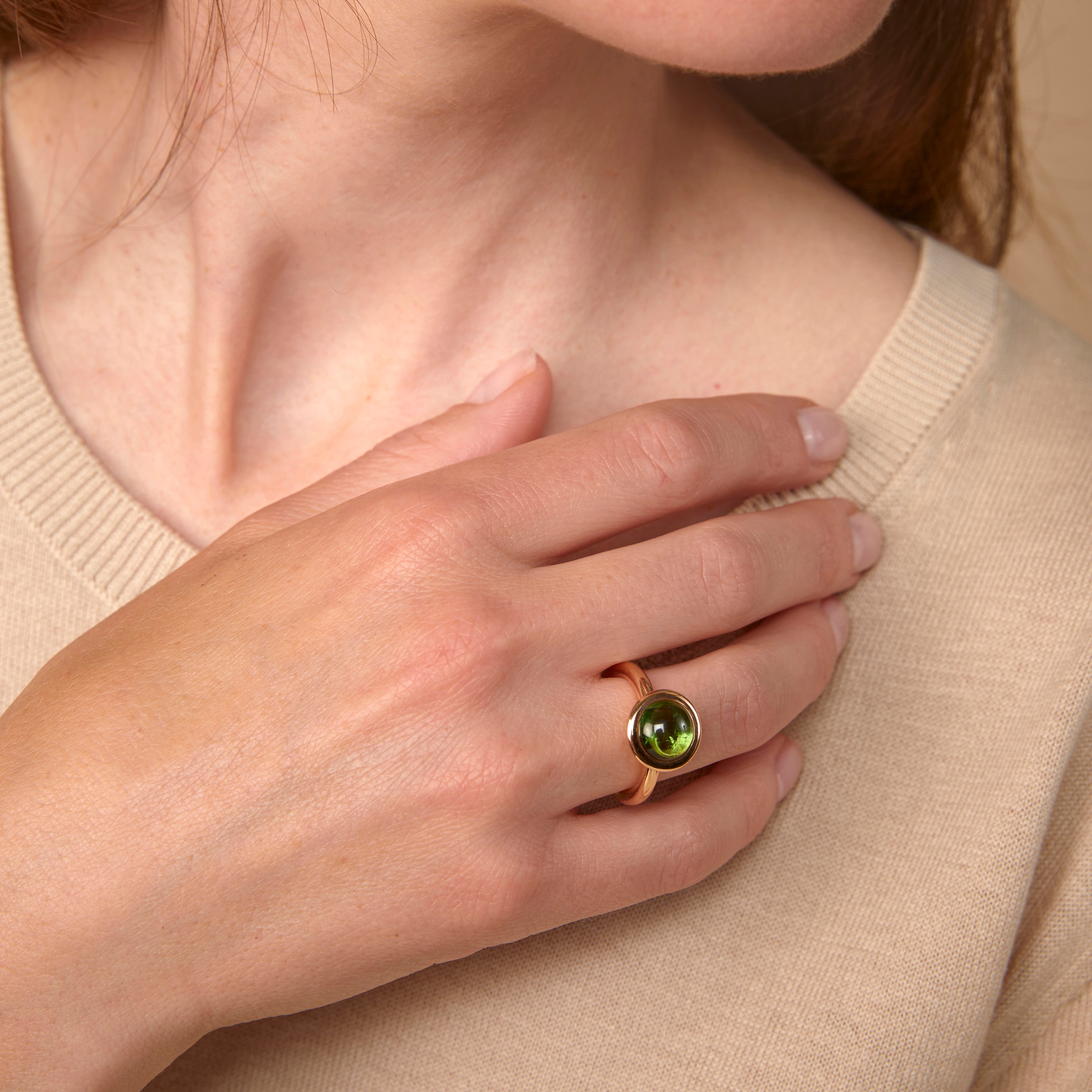 Ein leuchtend grüner Turmalin im Cabochon-Schliff, von Roségold umgeben. Wir lieben Sushi Ringe!